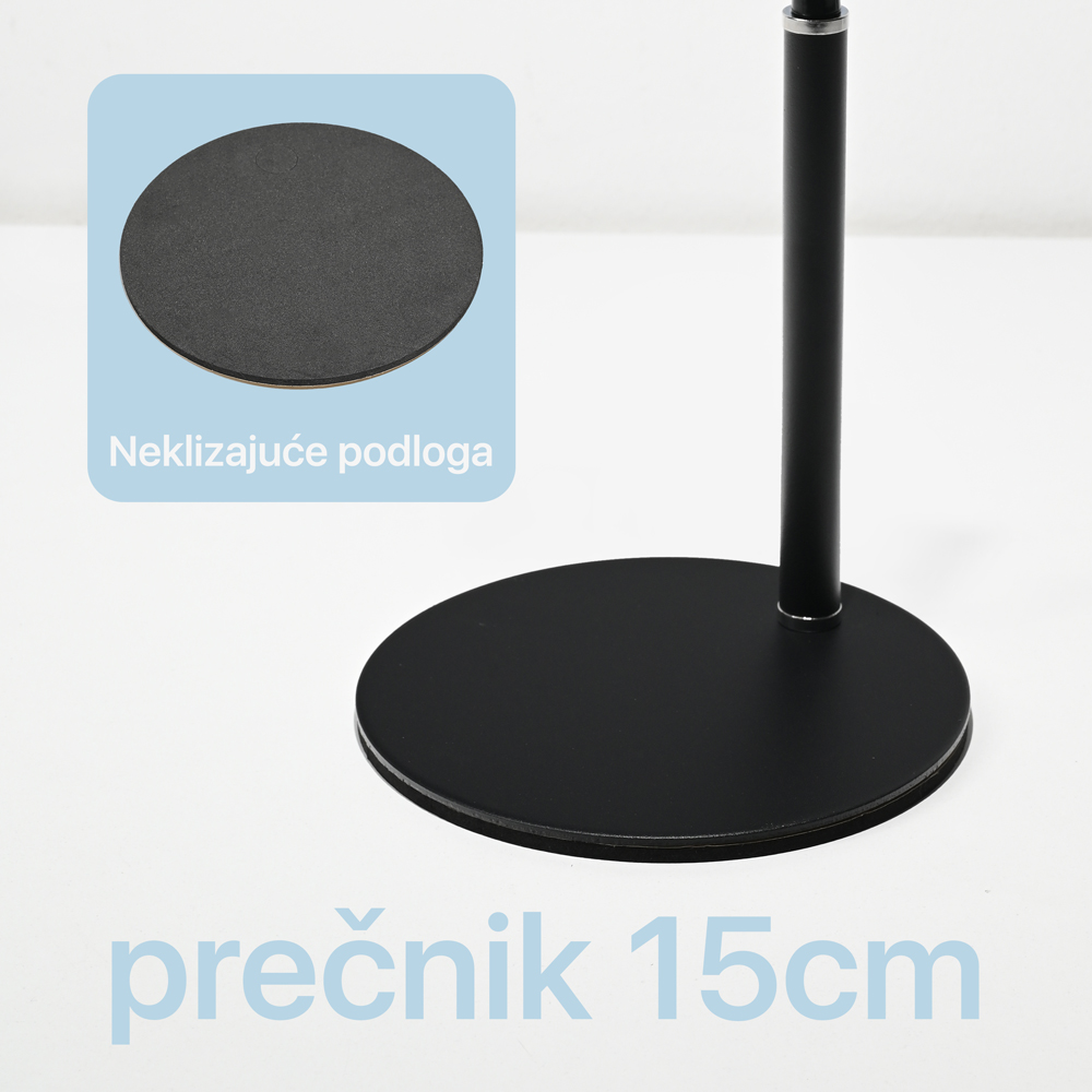 Praktičan dizajn: Držač za telefon ima kuglu koja se rotira 360 stepeni i fleksibilnu ruku dužine 15 cm. Visina se lako podešava između 22,5 cm i 31 cm. Prečnik baze je 15 cm. Podesiv je za snimanje videa, igranje igrica, gledanje filmova i obavljanje poziva.